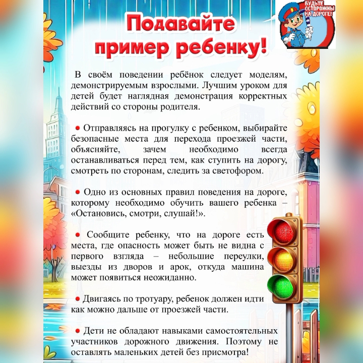 Очень важно для взрослых – самим правильно вести себя во всех ситуациях, демонстрируя детям безопасный образ жизни!